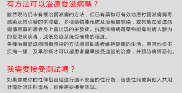 及早檢測,盡快求醫。由於HIV病毒經由性接觸及血液傳播,因此,在過去6個月曾有性接觸的對象也應接受檢查。